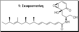 Tο 1997, η ομάδα του Δρ. Ogita απομόνωσε τη Σκυφοστατίνη (1) από τον μικροοργανισμό Trichopeziza mollisima. Αυτό το φυσικό προϊόν είναι ένας από τους πλέον ισχυρούς και εκλεκτικούς παρεμποδιστές της N-SMase (IC50 = 1 μM). Ο συνδυασμός δομικής πρωτοτυπίας και σημαντικής βιολογικής δράσης έχουν προσελκύσει το έντονο ενδιαφέρον πολλών ερευνητικών ομάδων διεθνώς. Πρόσφατα, η ομάδα του Καθ. Katoh δημοσίευσε την ολική σύνθεση της Σκυφοστατίνης (Angew. Chem., Int. Ed. 2004, 43, 4207-4209). Αυτή η πορεία βασίζεται στην ολεφινική μετάθεση και απαιτεί περισσότερα από είκοσι στάδια για την παρασκευή του υδρόφιλου εποξυκυκλοεξενονικού τμήματος. Οι δικές μας προσπάθειες στο αντικείμενο αυτό έχουν οδηγήσει στην παρασκευή νέων δραστικών αναλόγων (ChemBioChem 2003, 4, 1223-1225) και στην ανάπτυξη μιας συντομότερης, αποτελεσματικής και ευέλικτης συνθετικής πορείας για την παρασκευή του φαρμακοφορικού, υδρόφιλου τμήματος της Σκυφοστατίνης (Org. Lett. 2005, in press).